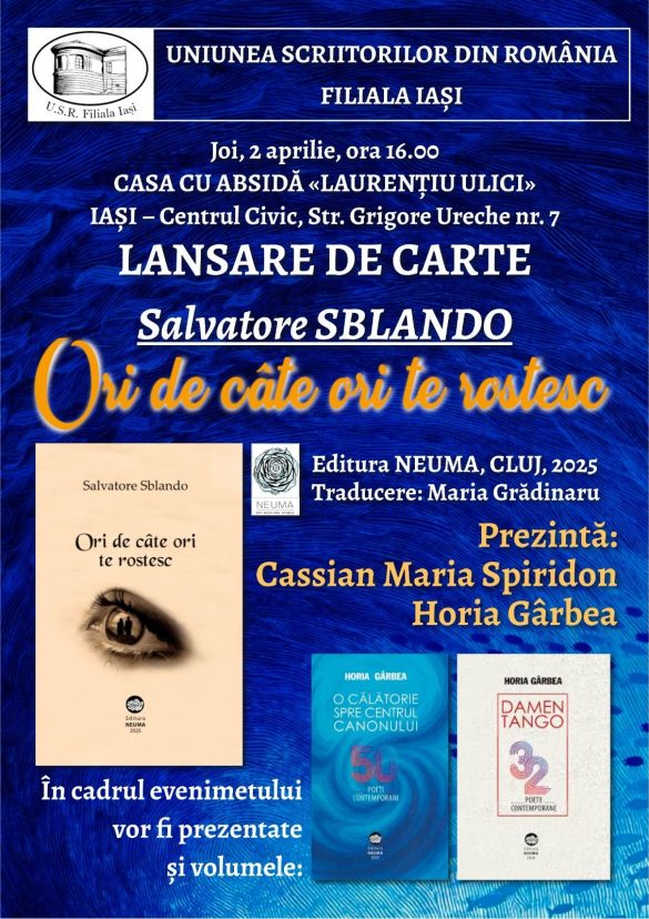 Joi, 2 aprilie 2026, ora 16, la Galeria de Artă Absida va avea loc lansarea volumului „Ori de câte ori te rostesc”, Editura Neuma (2025), de Salvatore Sblando, traducere din limba italiană de Maria Grădinaru. Volumul va fi prezentat de scriitorii Horia Gârbea și Cassian…