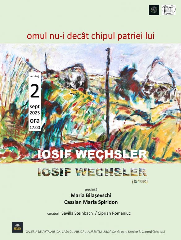 Marti 2 septembrie 2024, ora 17, va asteptam la Galeria de artă „Abida” la vernisajul expoziției artistului Iosif Wechsler (Israel), intitulata „Omul nu-i decât chipul patriei lui ”. Cu o susținută și bogată activitate creativă, artistul a avut de-a lungul timpului expoziții personale la galerii din orașele:…