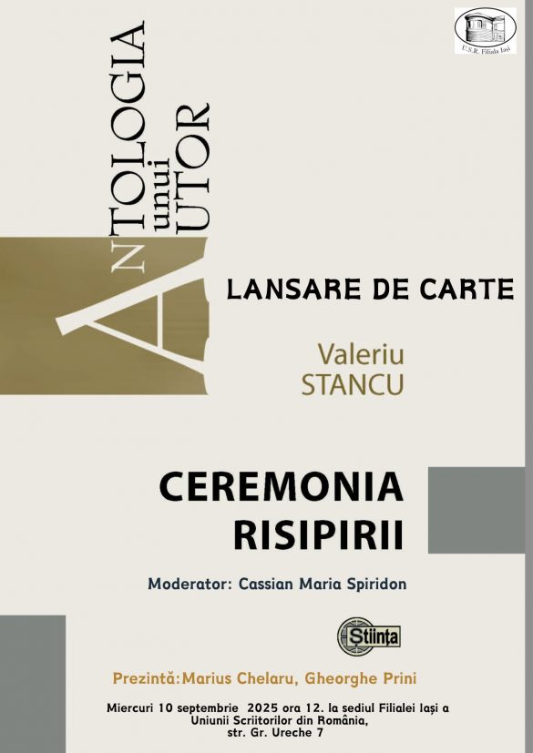 Miercuri 10 septembrie 2025 ora 12, la sediul Filialei Iași a Uniunii Scriitorilor din România va avea loc lansarea antologiei de versuri Ceremonia risipirii, autor Valeriu Stancu. Apărut la Editura Știința din Chișinău (director: Gheorghe Prini), volumul Ceremonia risipirii sintetizează traseul poetic al autorului printr-o…