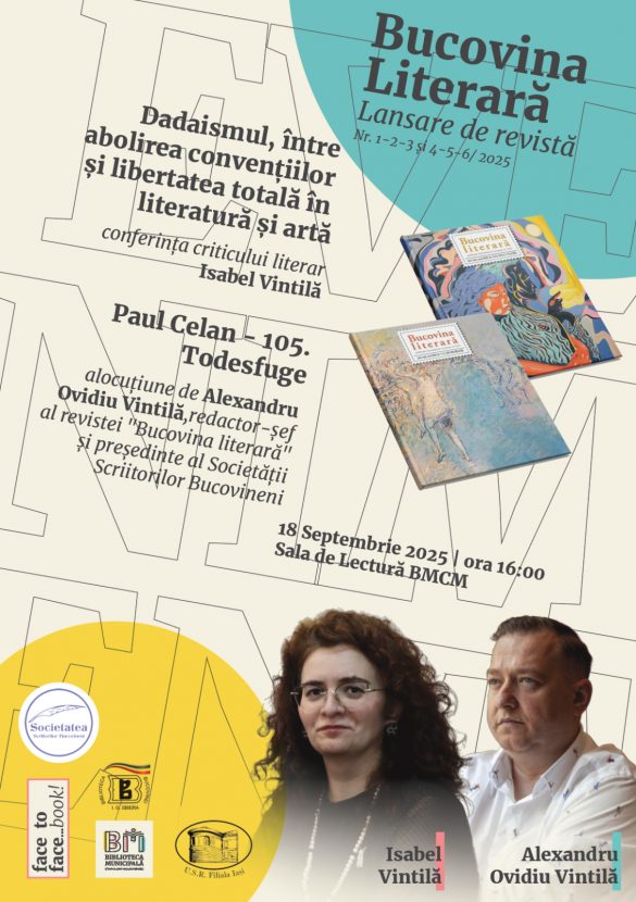 Joi, 18 Septembrie 2025, începând cu ora 16:00, la Biblioteca Municipală din Câmpulung Moldovenesc va avea loc evenimentul Bucovina Literară – lansare de revistă (numerele 1–2–3 și 4–5–6 / 2025). Dadaismul, între abolirea convențiilor și libertatea totală în literatură și artă. Conferința criticului literar Isabel Vintilă….