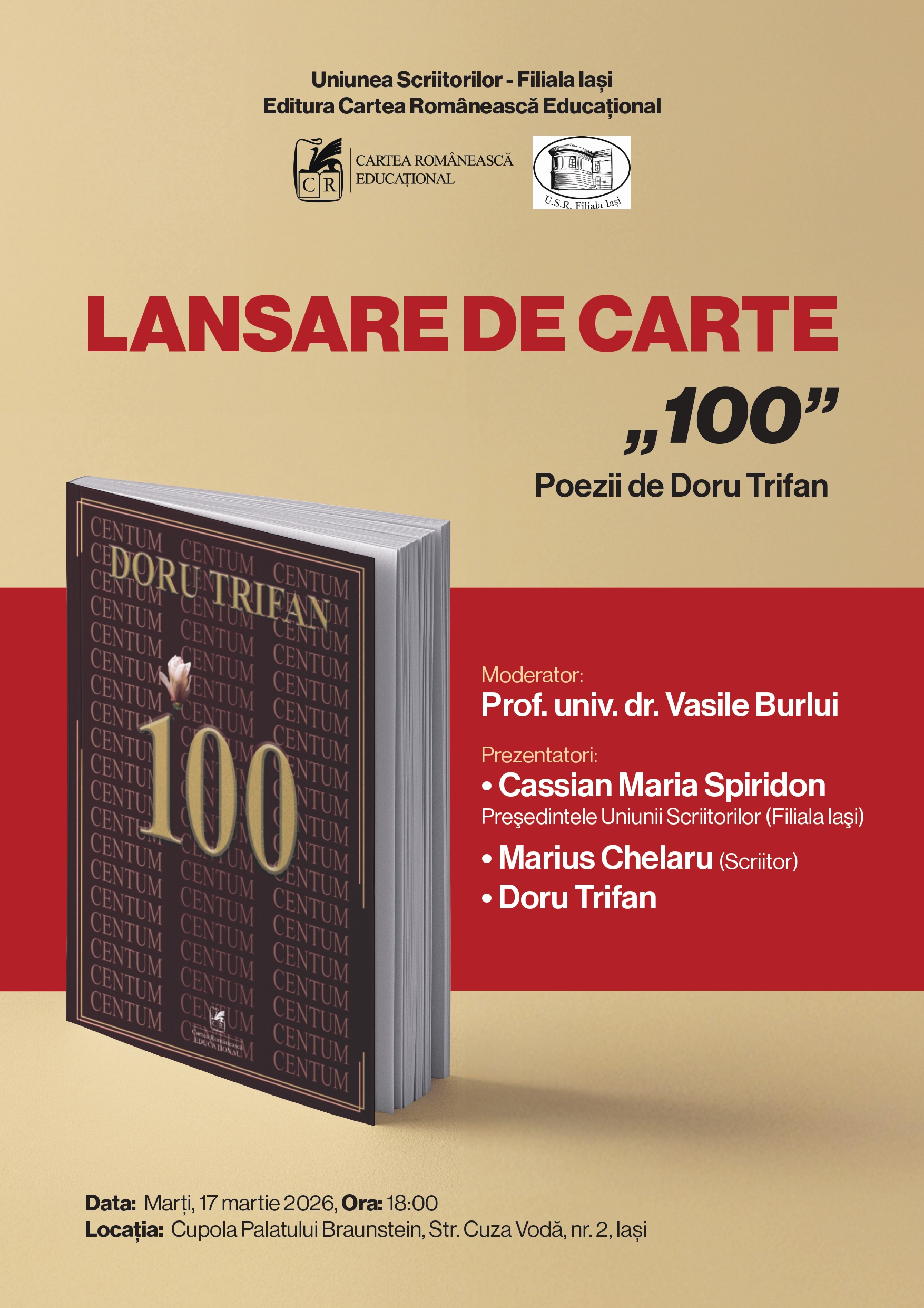 Lansarea vomulului „100”, poezii de Doru Trifan, apărut la Editura Cartea Românească Educațional, va avea loc marți, 17 martie 2026, ora 18, la Palatul Braunstein. Cartea va fi prezenatată de Cassian Maria Spiridon și Marius Chelaru. Moderator: Vasile Burlui.