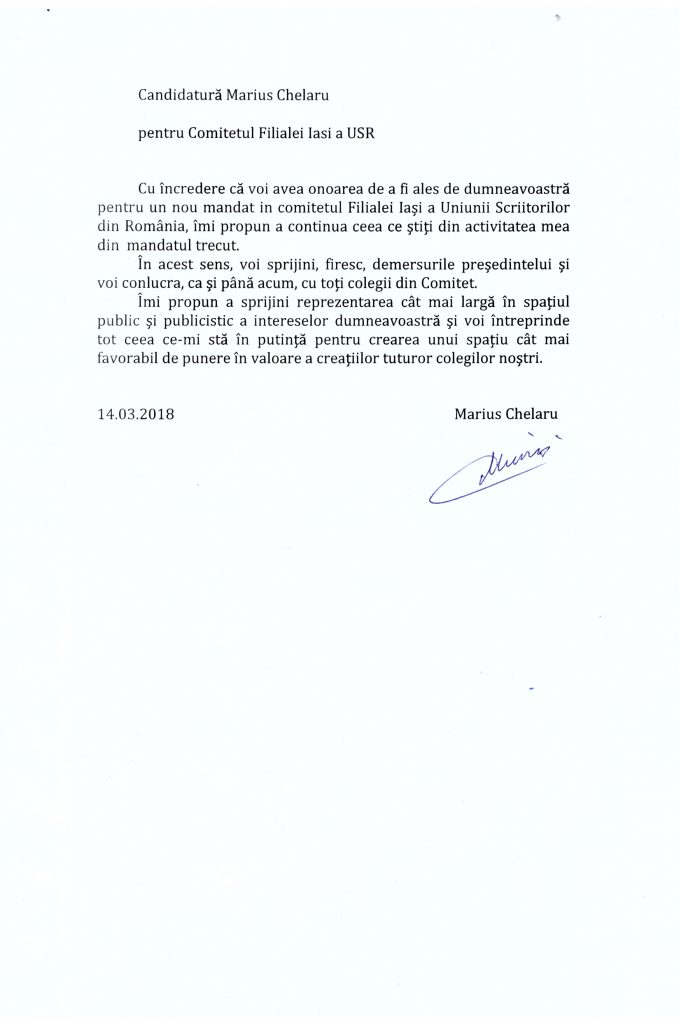 ALEGERI MARIUS CHELARU Related posts ALEGERI, Evenimente, Featured, Uncategorized SIMONA VASILACHE: PROGRAM DE CANDIDATURĂ PENTRU FUNCȚIA DE PREȘEDINTE AL UNIUNII SCRIITORILOR DIN ROMÂNIA ALEGERI, Evenimente, Featured CONVOCATOR Adunarea Generală a Filialei Iasi a Uniunii Scriitorilor din România ALEGERI Candidatura Marius Chelaru ALEGERI CANDIDATURA IOAN HOLBAN ALEGERI, Evenimente, Uncategorized VARUJAN VOSGANIAN: PROGRAM DE CANDIDATURĂ PENTRU FUNCȚIA DE PREȘEDINTE AL UNIUNII SCRIITORILOR DIN ROMÂNIA ALEGERI, Evenimente, Featured CONVOCATOR Adunarea Generală a Filialei Iași a Uniunii Scriitorilor din România